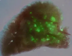 ▲綠色熒光標(biāo)記的人肺干細(xì)胞成功移植到小鼠肺內(nèi)