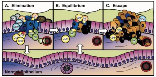 腫瘤免疫編輯理論(Cancer Immunoediting):癌癥發(fā)生需要經(jīng)過(guò)3個(gè)階段,即免疫監(jiān)視、免疫平衡和免疫逃逸。腫瘤細(xì)胞必須躲避開(kāi)免疫細(xì)胞的追殺,才能不斷地在體內(nèi)發(fā)生發(fā)展。這一理論奠基了腫瘤免疫治療的基礎(chǔ),因此被視為免疫治療的基礎(chǔ)理論之一。