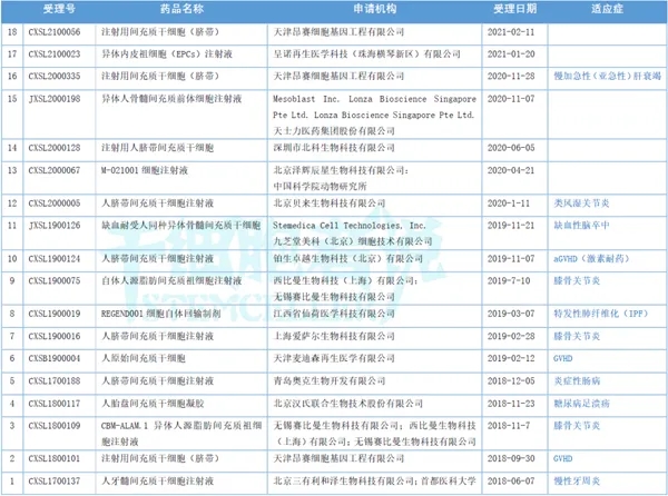 截止目前(2021年2月18日),國內(nèi)共有11家企業(yè)的13款干細胞藥物獲準默許進入臨床試驗。