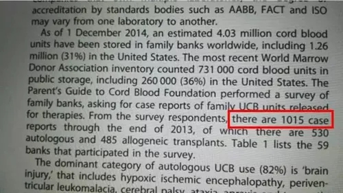 以下這篇文獻(xiàn)顯示:截止2013年,全球自體臍帶血用于移植的數(shù)量有1015例。其中自體臍帶血移植為530例,自存臍帶血用于異基因移植(親緣臍帶血移植)為485例。