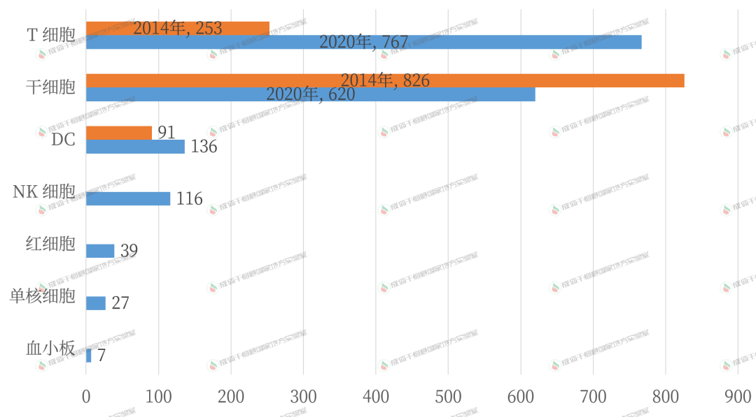 有研究者分析了截止 2020 年 8 月的 28 種獲批上市的細(xì)胞治療產(chǎn)品(本文更新到 32 種)和 1705 種當(dāng)前活躍的細(xì)胞治療臨床試驗(yàn)。他們發(fā)現(xiàn):和 6 年前相比,免疫細(xì)胞臨床試驗(yàn)數(shù)量增長(zhǎng)了 2 倍。細(xì)胞產(chǎn)品增加了 18 種,其中干細(xì)胞和其他細(xì)胞仍占據(jù)優(yōu)勢(shì)。