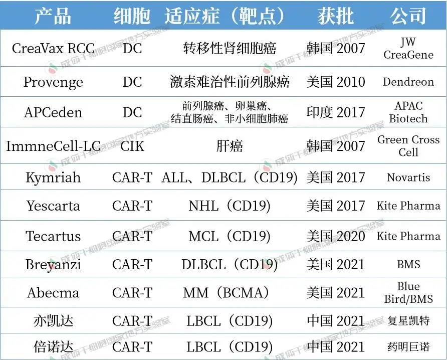 目前,只有 T 細(xì)胞和樹(shù)突狀細(xì)胞(DC)產(chǎn)品被批準(zhǔn)上市。其中大多數(shù) T 細(xì)胞產(chǎn)品是用于血液系統(tǒng)惡性腫瘤的嵌合抗原受體T細(xì)胞(CAR-T)療法,而 DC 產(chǎn)品則用于實(shí)體腫瘤的疫苗。