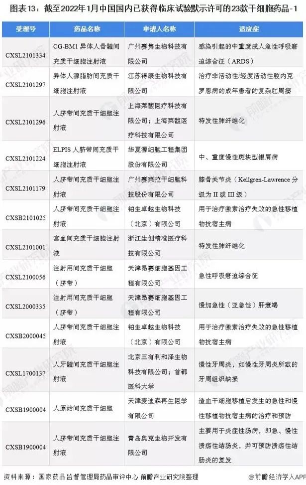 在干細胞臨床應用方面,根據國家藥品監(jiān)督管理局藥品審評中心(CDE)公示信息顯示,截止2022年1月5日,共有23個干細胞新藥項目獲得國家臨床默示許可。分別是胎盤、臍帶、骨髓、牙髓、宮血、異體/自體脂肪來源的間充質干細胞,適應證包括了膝骨關節(jié)炎、類風濕關節(jié)炎、糖尿病足潰瘍、肺纖維化、肝衰竭、卒中、急性呼吸窘迫綜合征、牙周炎、克羅恩病和GvHD等。