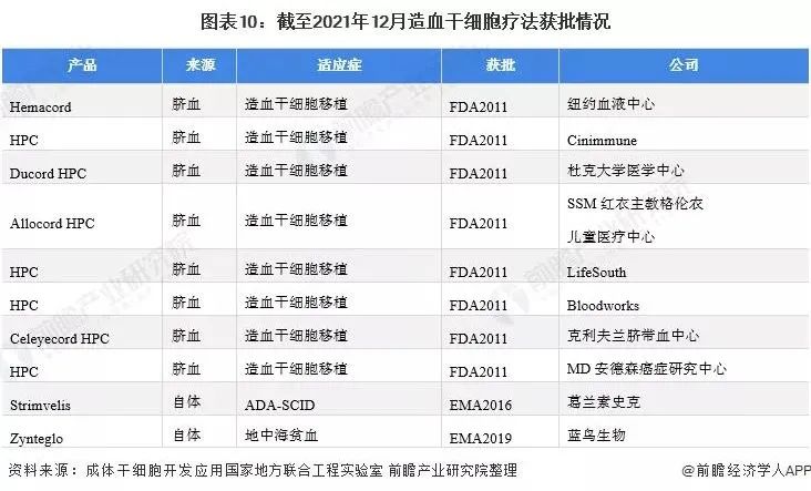 目前獲批的造血干細胞療法是10種,包括 FDA的8種臍血產品和EMA批準的2種自體造血干細胞基因療法,Strimvelis用于腺苷脫氨酶缺乏癥(ADA-SCID),Zynteglo用于治療輸血依賴性地中海貧血癥。