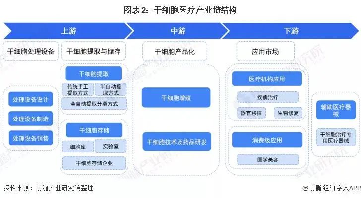 經過多年發(fā)展,中國干細胞醫(yī)療行業(yè)具備了一定的產業(yè)基礎。從上游的干細胞存儲,中游的藥物研發(fā)到下游的臨床治療,目前已形成了相對完整的干細胞產業(yè)鏈。其中上游是最成熟的一環(huán),中下游仍有待進一步拓展。相關業(yè)務主要集中在上游,而中下游業(yè)務目前大多處于臨床實驗階段或市場實驗階段。