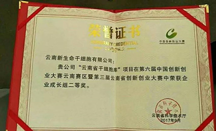 我司申報的“云南省干細胞庫”項目獲得由云南省科技廳授予的第三屆云南省創(chuàng)新創(chuàng)業(yè)大賽成長組二等獎,最終成功晉級第六屆中國創(chuàng)新創(chuàng)業(yè)大賽生物醫(yī)藥行業(yè)總決賽。