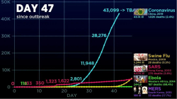 COVID-19相對SARS起病慢,無癥狀也傳染,因此數(shù)據(jù)有一定滯后性。其感染人數(shù)則在第26天超過同時期的SARS,截止視頻制作的時間,數(shù)據(jù)停在第42天的43099人。
