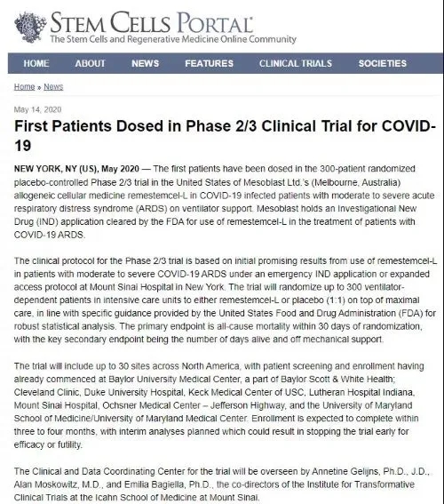 報告中提到了兩項試點研究,一項是3月份西奈山醫(yī)院的研究,一項是7月份發(fā)表在《柳葉刀》上的研究。間充質(zhì)干細胞被用來治療這兩項研究之間的25個重癥COVID-19病例。在3月的試驗中,12名患者中有10人存活下來。而在7月的試驗中,13名患者中有11人存活下來。