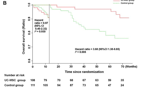 生存率改善:通過(guò)Landmark分析,在13個(gè)月至75個(gè)月的隨訪期間,臍帶干細(xì)胞治療組的總生存率明顯高于對(duì)照組。