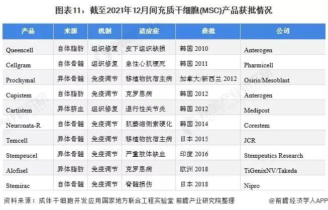 目前獲批的間充質干細胞(MSC)產品同樣是10種,目前的MSC產品根據其作用機制和批準的適應癥分為兩大類:組織修復和免疫調節(jié)。