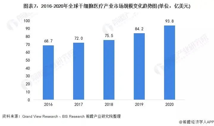 由于干細胞治療廣闊的應用前景,全球干細胞行業(yè)迅猛發(fā)展,市場規(guī)模逐漸擴大。近年來,干細胞研究及應用已成為衡量一個國家生命科學與醫(yī)學發(fā)展的重要指標,許多國家對干細胞研究大力支持。根據國際研究機構Grand View Research的研究數據顯示,全球干細胞市場規(guī)模從2016年的68.7億美元增長到2020年的93.8億美元。與此同時,BIS Research的研究數據顯示,2018年全球干細胞市場規(guī)模為75.54億美元。